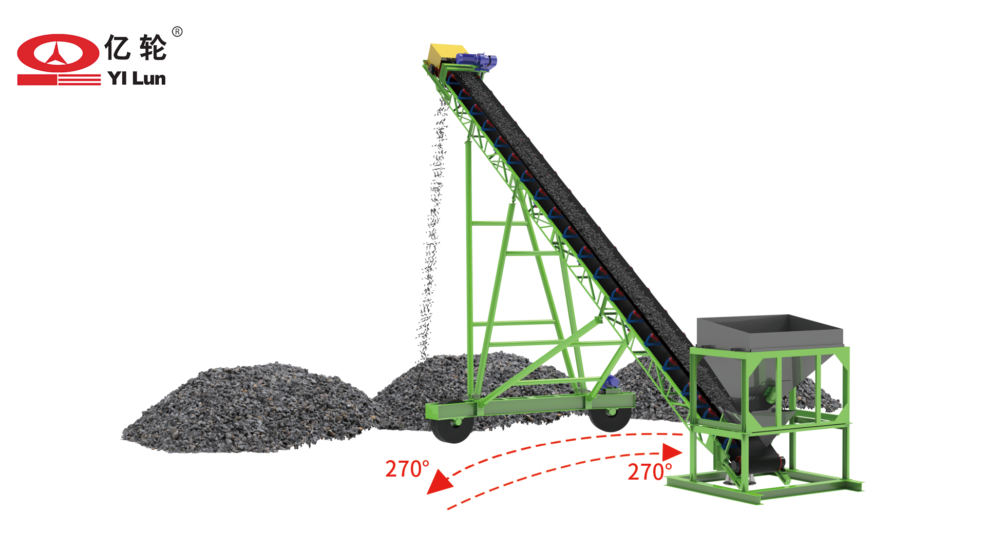 擺動堆料輸送機(jī)是上料點(diǎn)固定,輸送機(jī)主架以上料點(diǎn)為中心做弧形/扇形轉(zhuǎn)動。此款輸送機(jī)不僅能實(shí)現(xiàn)定點(diǎn)圓錐形堆料,還能實(shí)現(xiàn)水平扇面堆料。